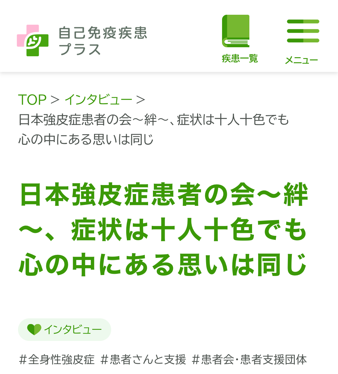 自己免疫疾患プラスにインタビュー記事を掲載いただきました。 メディア掲載 2025.09.05 自己免疫疾患に関する情報を発信するwebメディア『自己免疫疾患プラス』に当会代表津田へのインタビュー記事を掲載いただきました。 強皮症の診断時の様子 患者会を立ち上げた経緯 患者会運営で大事にしていること などお話しさせて頂きました。 お時間ある時にご覧ください。 インタビュー記事を見る